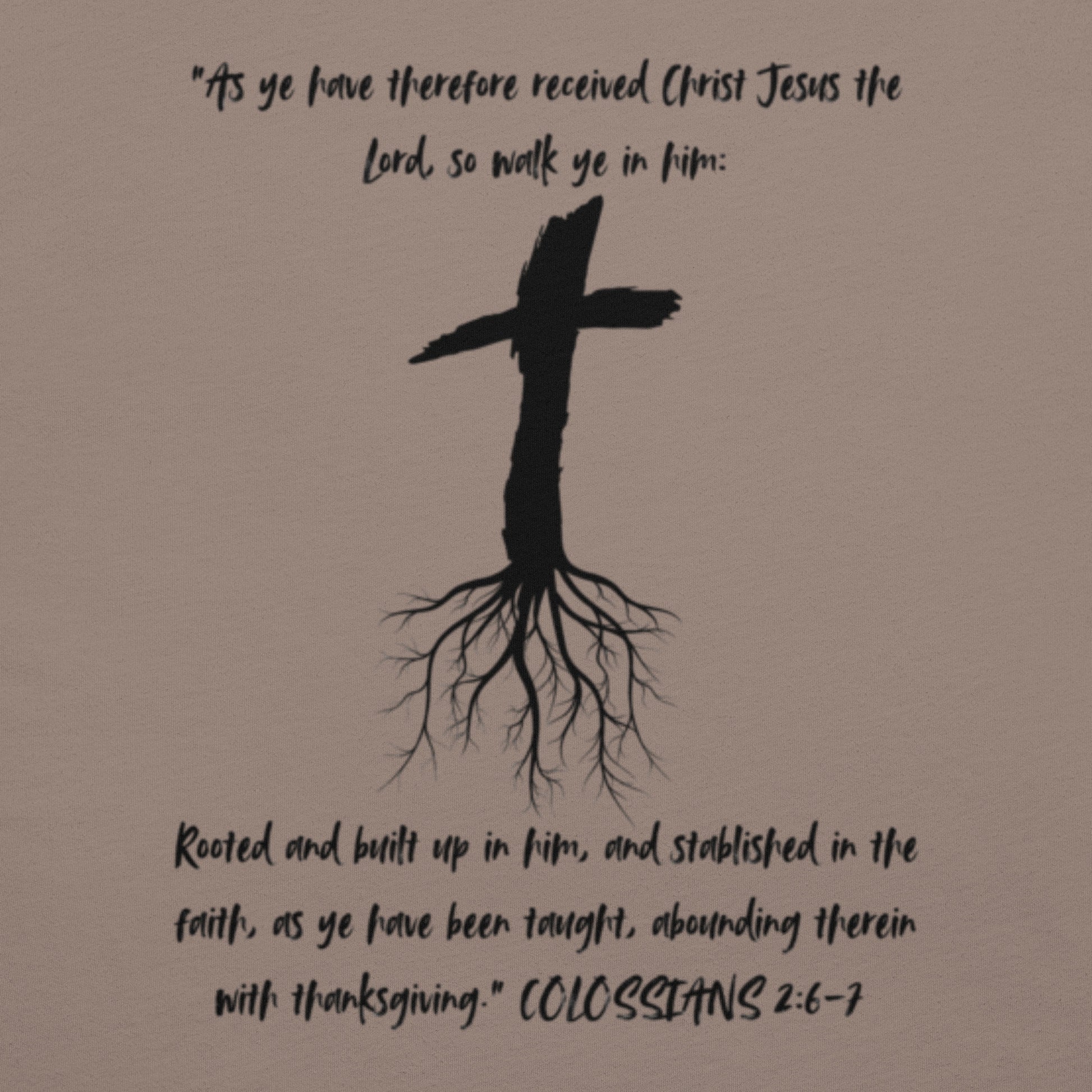 Rooted in Faith: Colossians 2:6-7 Christian T-shirt with Cross Design