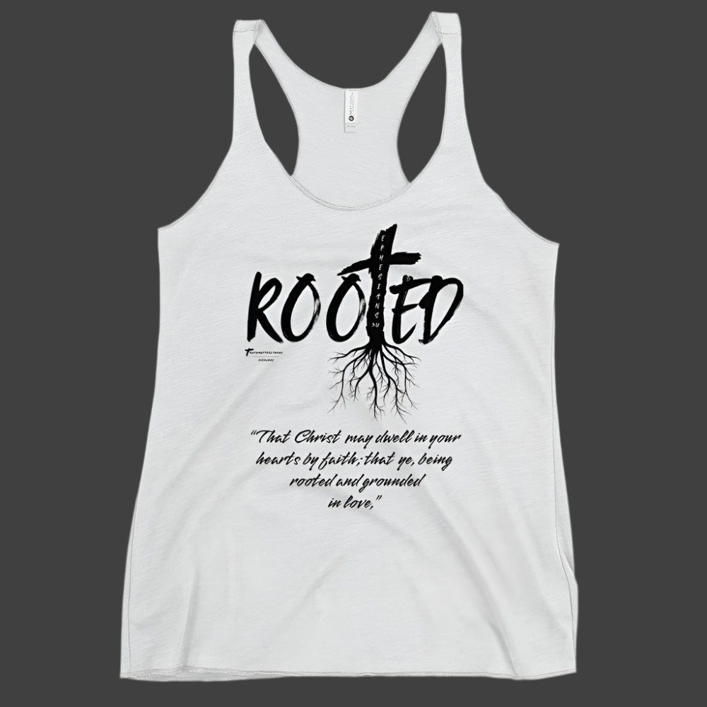 Embrace faith and style with Truth Matters’ Rooted Daily Bible Scripture Racerback Tank. The front showcases 'ROOTED' with a cross and tree roots replacing the 'T,' paired with Ephesians 3:17 (KJV): ‘That Christ may dwell in your hearts by faith; that ye, being rooted and grounded in love.’